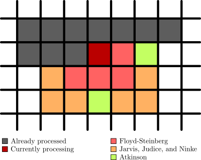 The underlying problem, which I’ll call the dependency problem as it is caused by pixels being dependent on the output of previous pixels, is present in all Floyd-Steinberg style algorithms. And there are quite a few of these, after all they are typically the kind of algorithm which produces the best visual results. In terms of the dependency problem there are some slight differences though. Jarvis, Judice & Ninke is more affected because it spreads error to more pixels; Atkinson is slightly better because it “loses” error; and Riersma, which diffuses error along a Hilbert curve instead of out from the top left, is slightly less affected but performs worse in general and is even harder to parallelize. The dependency problem is the first of the technical issues, and maybe the most critical one.
