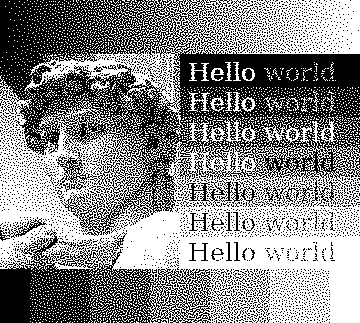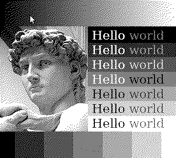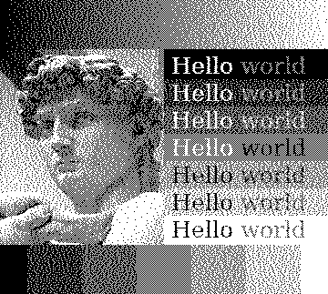 Because the “pattern” here is just noise it is no longer as discernible in the output, in this image the pattern is the same size as the image. If you tiled a smaller pattern you could be able to discern some structure, especially in large single colour areas, but a lot of the repetition is hidden by the noise. Since the size of the monitor is known I can easily just create a blue noise pattern for the entire screen, so this test is more realistic. The second problem is what I call the transition problem. Since there is no context from surrounding pixels hard edges are often softened up. Especially the text is harder to read compared error-diffusion dithering because the hard edges are preserved better and even the Bayer matrix performs better because the pattern is much less organic. The boxes around the text and along the bottom also has fuzzier borders, and even Davids sharper features are a bit softened. Applying a different threshold to every pixel like what both the Bayer matrix and blue noise does will indeed give us the right amount of black pixels, but in a way it means that we lose resolution. The sharp transitions from one colour to another doesn’t quite resolve properly and appear noisy in the output image.