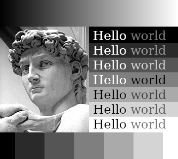 Going into this project I thought that dithering would be one of the simple parts, after all dithering has been used for ages to improve graphical fidelity in systems with limited palettes. So we could simply pick whatever is the “best” dithering algorithm and off we go! Unfortunately this wasn’t the case. Many of the reasons seems to stem from when these approaches where made and the hardware they where made for, but some of them are more technical in nature. One of these historical issues is that these algorithms were mostly designed to display images on black and white screens in an otherwise controlled environment. So all the menus, windows and buttons would be carefully hand drawn, and the dithering algorithm would only be called upon to show images. This means that a lot of dither algorithm evaluation and comparison is done on simple images like the ones shown so far in this article. This isn’t the system we will be using the algorithm in however. Of course I’ll carefully set up the theme and icons to work well on the display. But what other programs, and maybe especially the web, does is out of my control. Therefore I’ve constructed a test image which I’ll use throughout this article which combines an image, some gradients, some solid coloured blocks, and some text on various backgrounds: